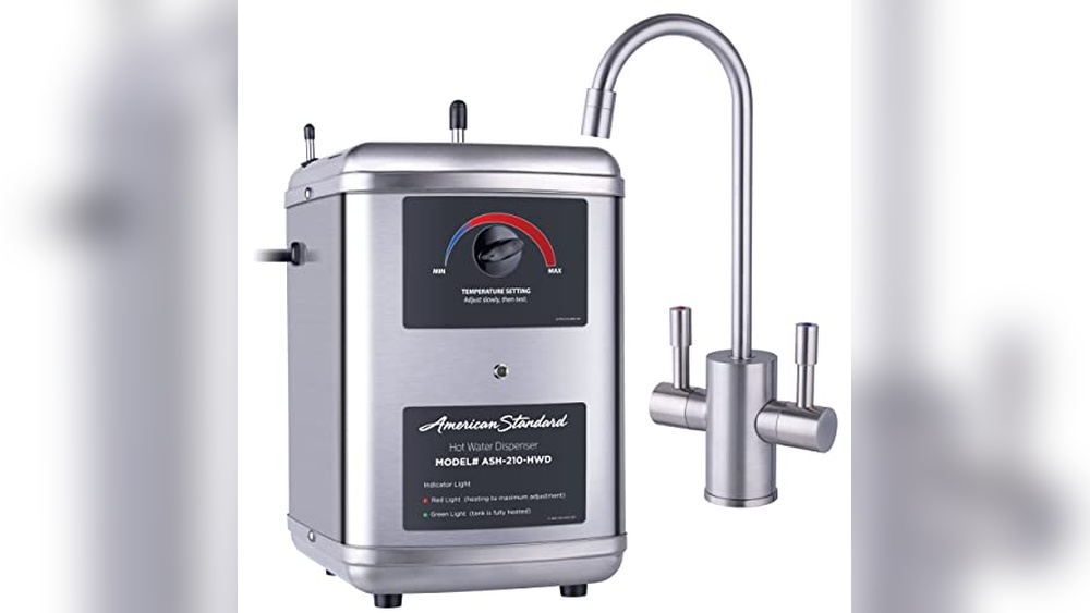 The American Standard Instant Hot Water Dispenser is an under-sink unit designed to provide more than 60 cups of near-boiling water per hour, making it perfect for quick cooking, coffee, tea, and other household needs. Its adjustable temperature control from 140°F to 200°F ensures versatility for various tasks, while the 2.5-quart stainless steel tank with a 1300-watt heating element delivers fast recovery times.