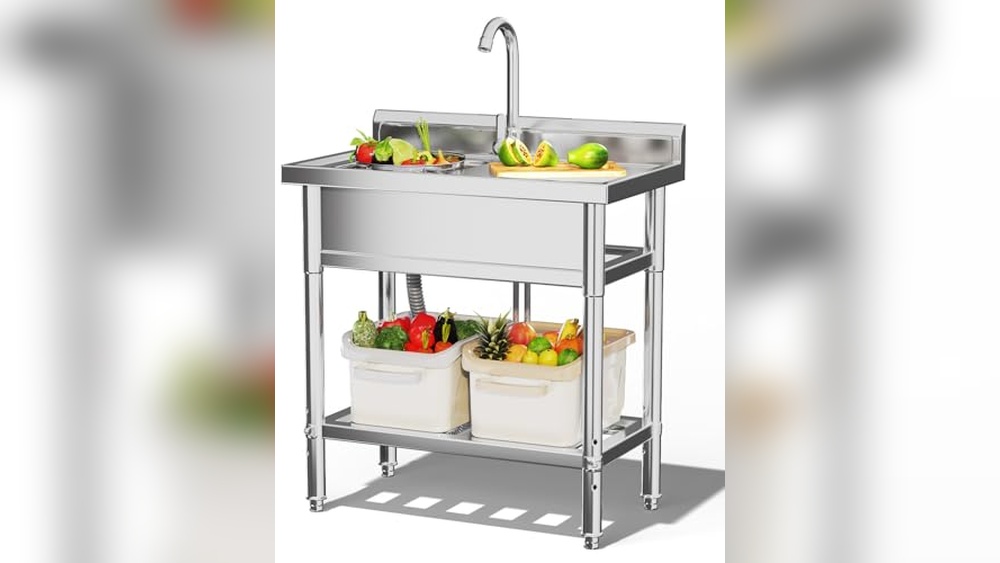 The JFHID Stainless Steel Freestanding Sink is a single-bowl utility sink designed to provide extra workspace and storage in busy environments like kitchens, garages, and laundry rooms. Its large, deep basin simplifies washing tasks, while the multi-layer shelves underneath keep tools and supplies organized and within easy reach.